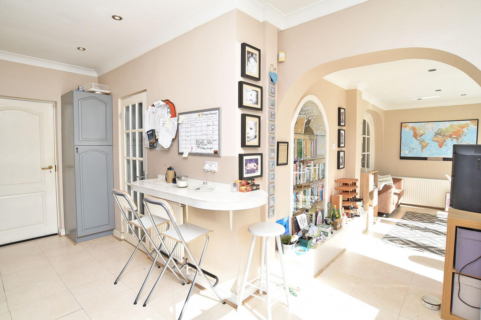 Fitted with a range of wood units with cream worktops and tiled splashbacks. Matching breakfast bar. Space for a cooker, washing machine, fridge, and dishwasher. Door leading onto the rear patio and garden.