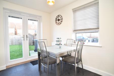 A superb open-plan kitchen and dining space with patio doors leading to the garden. The kitchen comprises a range of modern fitted units with worktops, integrated oven, hob and extractor, and space for appliances.