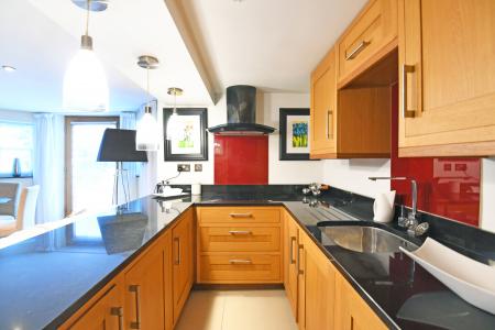 A modern fitted kitchen with a range of wall and base units with granite worktops and integrated appliances.