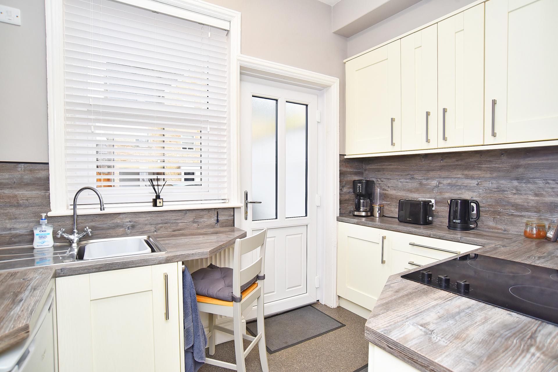 A modern fitted kitchen with a range of wall and base units with electric hob and integrated oven. Space for fridge. There is a window to rear, and a glazed door provides private entrance to the rear.