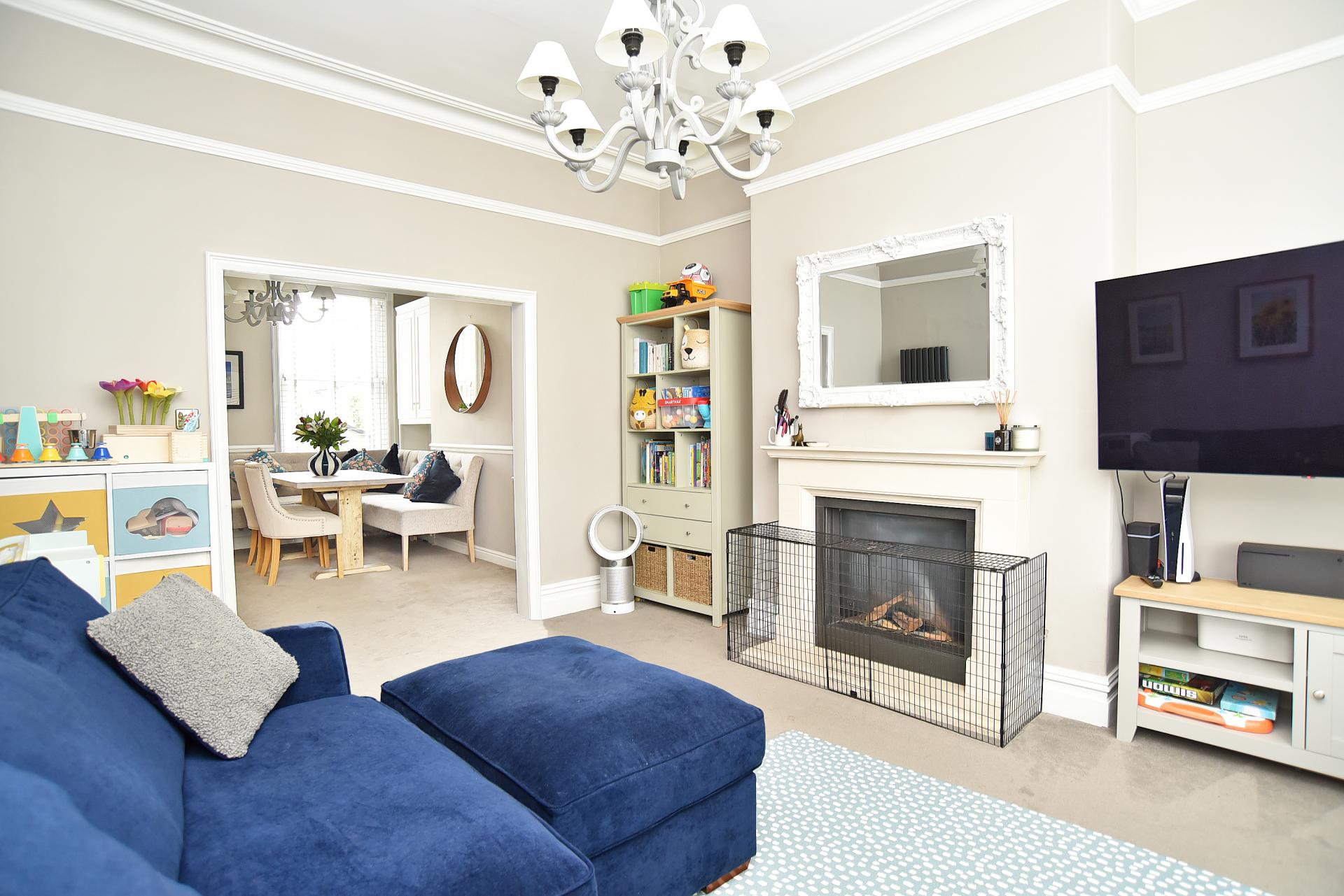 A bay-fronted reception room with feature living flame gas fire. Original cornices and picture rails. Open plan to the dining area.
