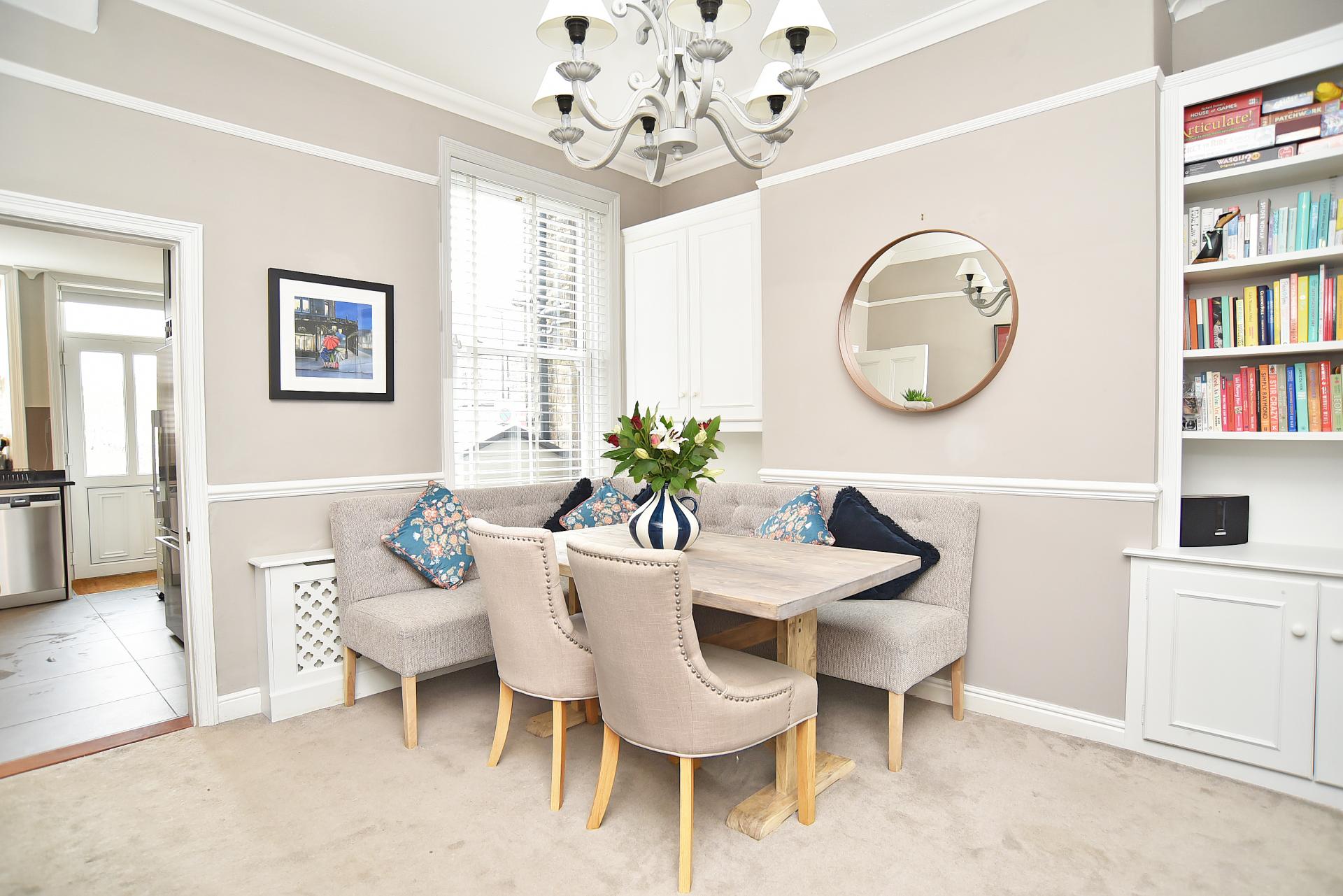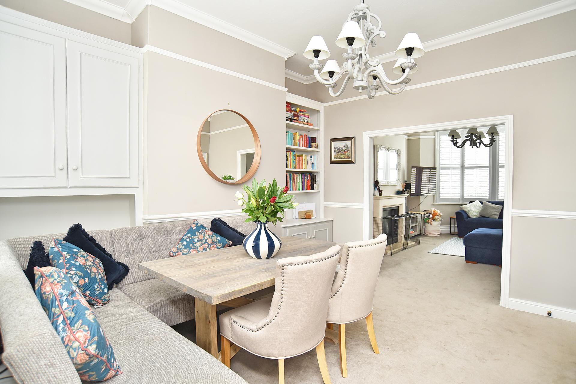 A spacious dining area with room to accommodate a large dining table. Retains period features including cornices and picture rails. Fitted shelving and cabinets.
