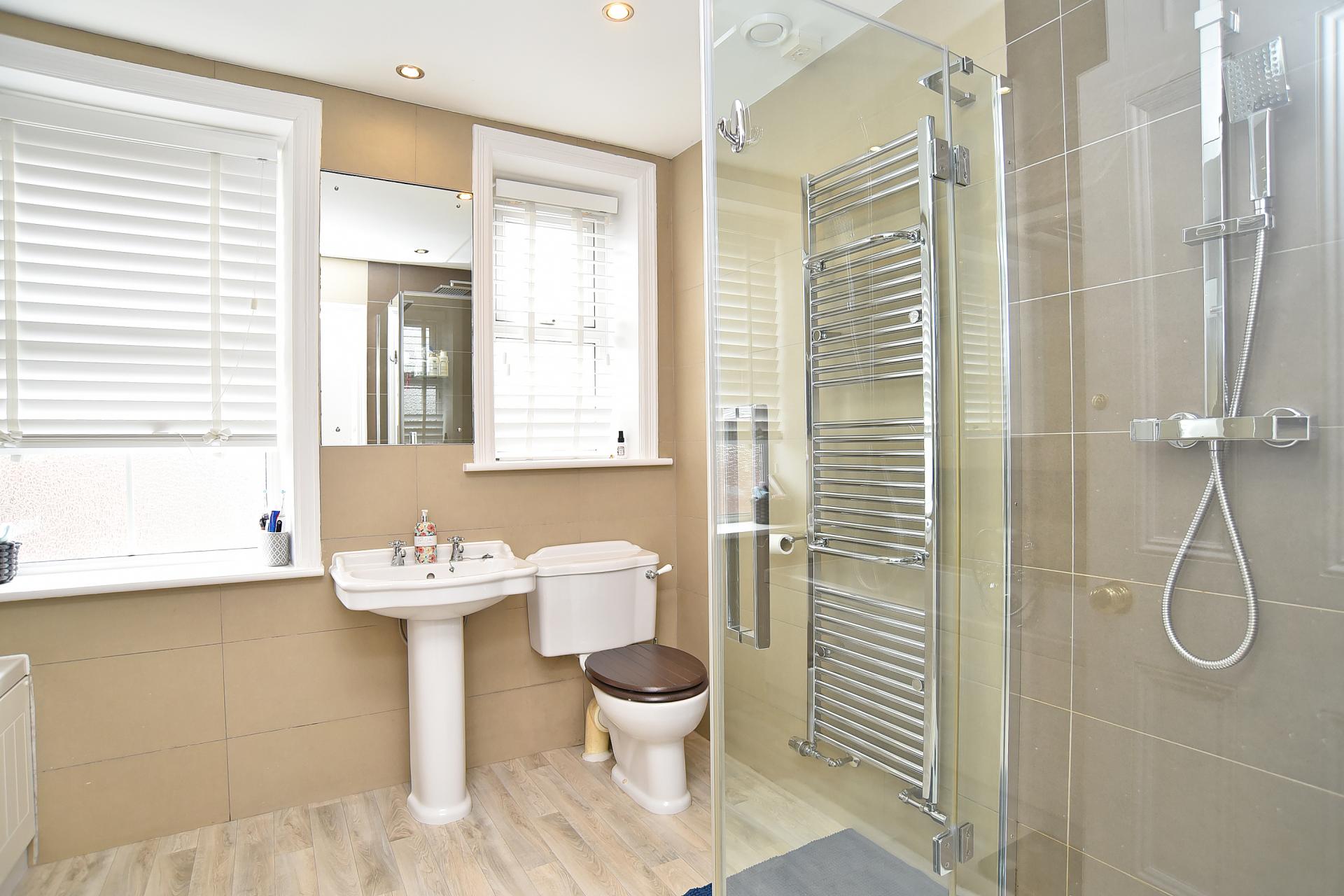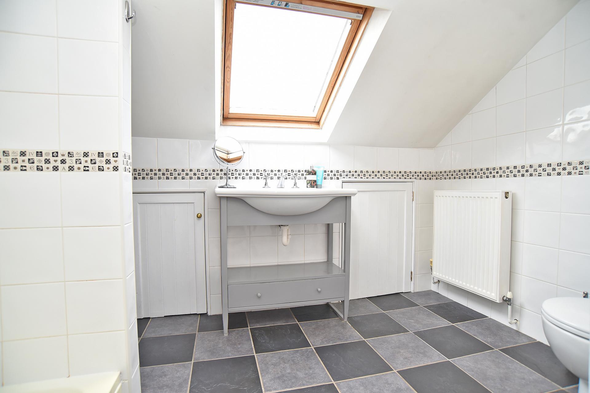 Modern suite comprising WC, basin and shower. Underfloor heating. Eaves storage space.
