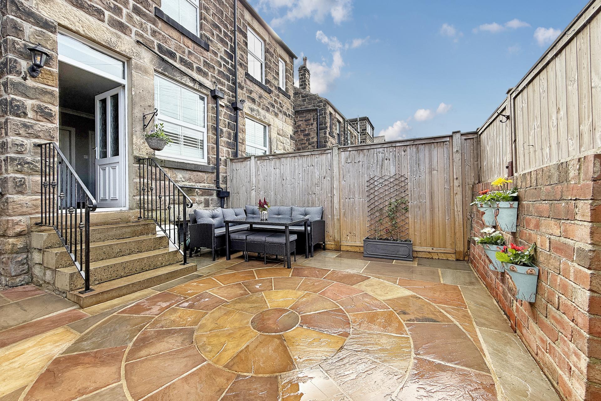 To the rear, there is a beautifully landscaped enclosed garden with a large flagged patio seating area – ideal for outdoor entertaining.