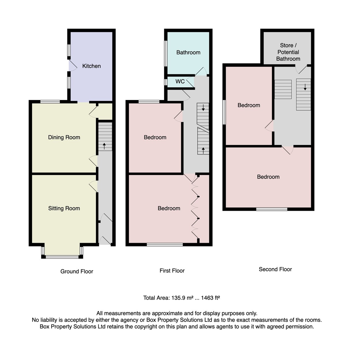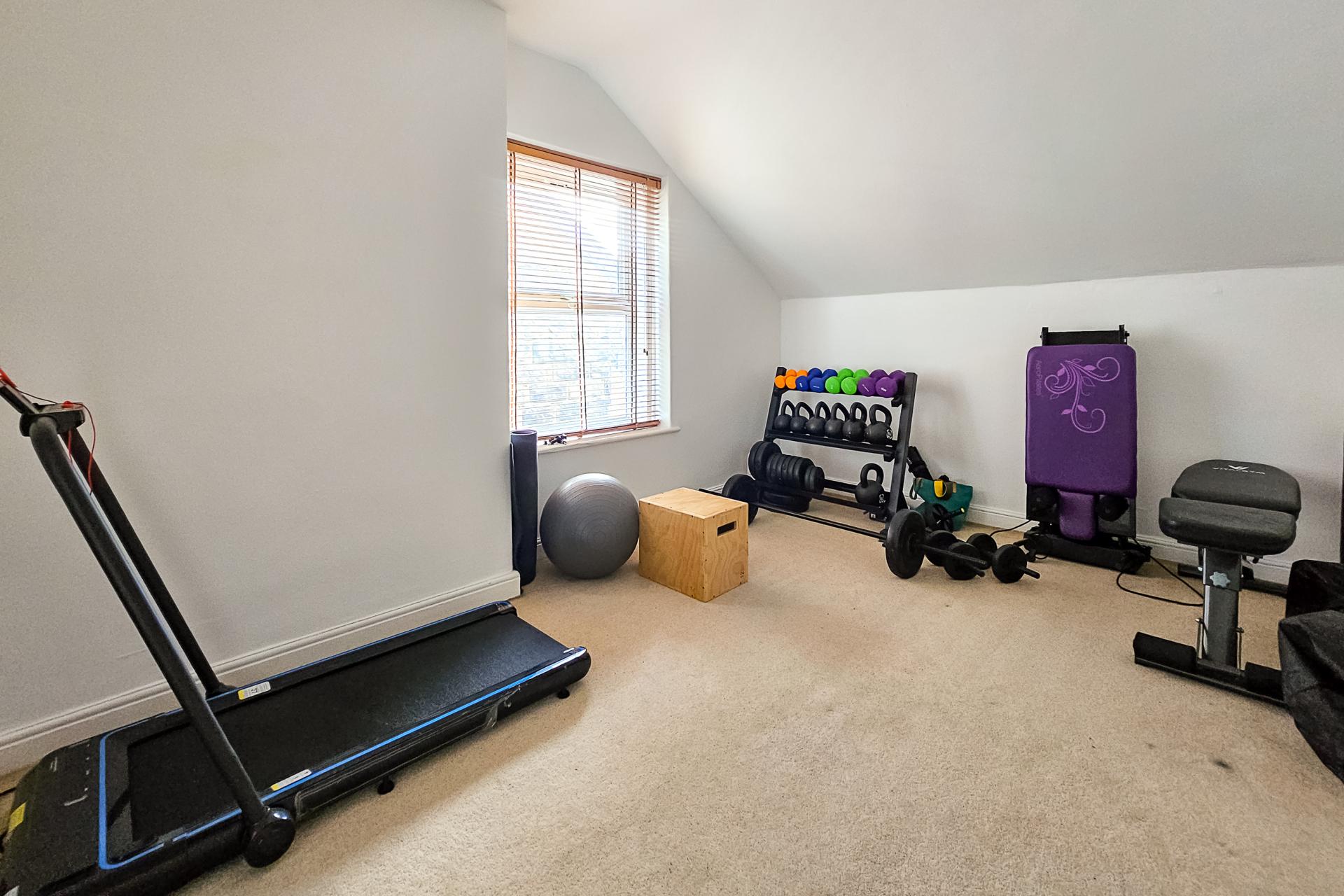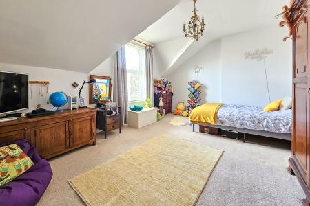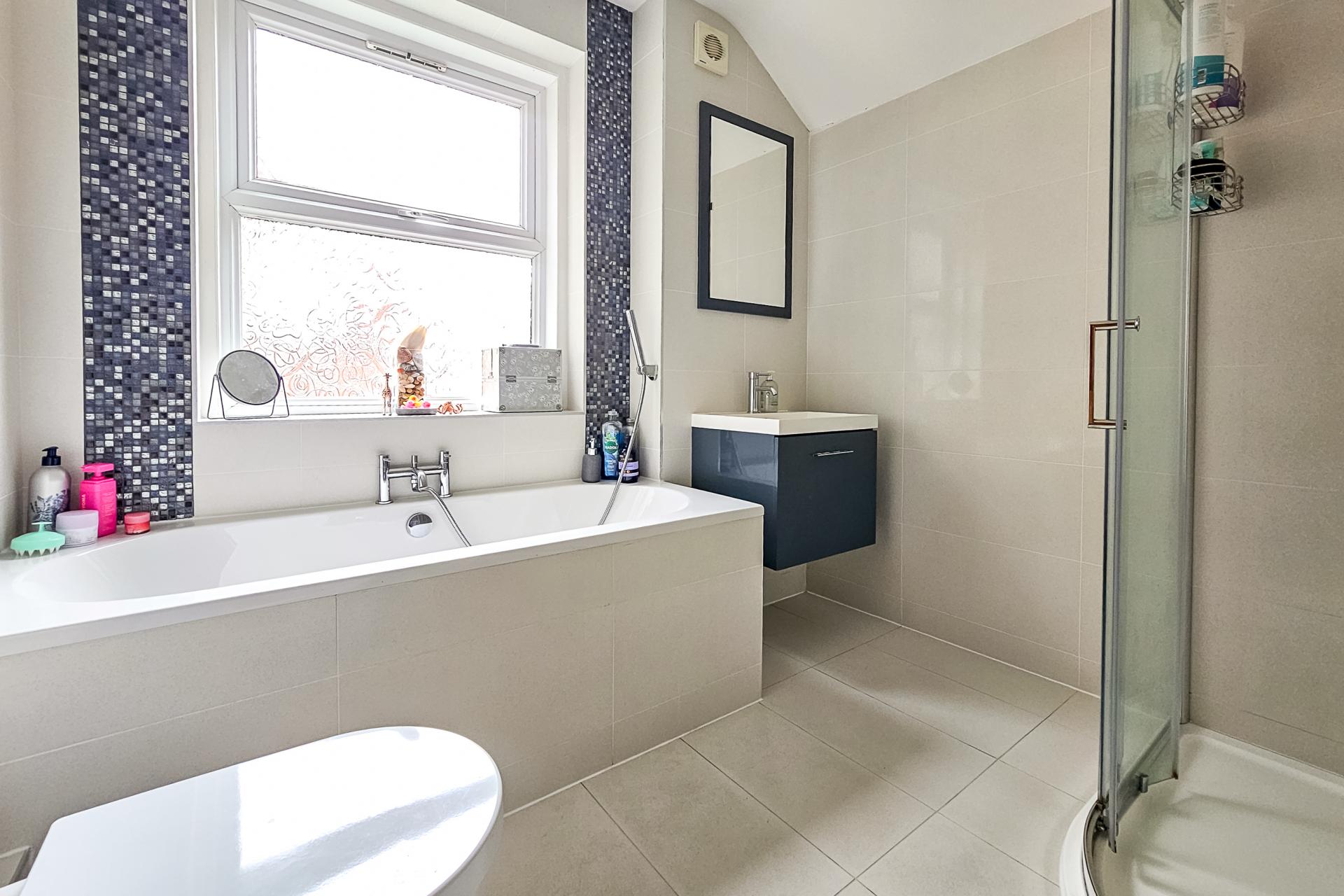 The first floor offers two substantial double bedrooms, both providing excellent space and natural light. A modern bathroom includes a white suite with WC, vanity unit, bath and shower, complemented by an additional separate WC for added practicality. The second floor comprises two further bedrooms and easy access to a useful loft storage space via a pull-down ladder.