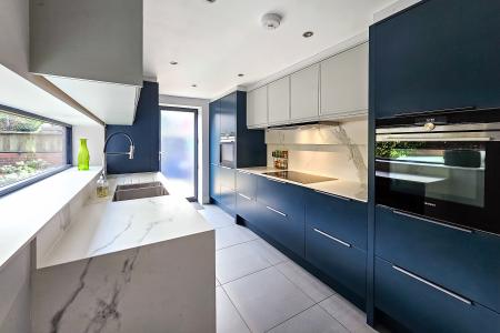 Fitted with a range of modern units, electric hob, 2 integrated multi function ovens, dishwasher, and fridge/freezer. Door leads to the garden.