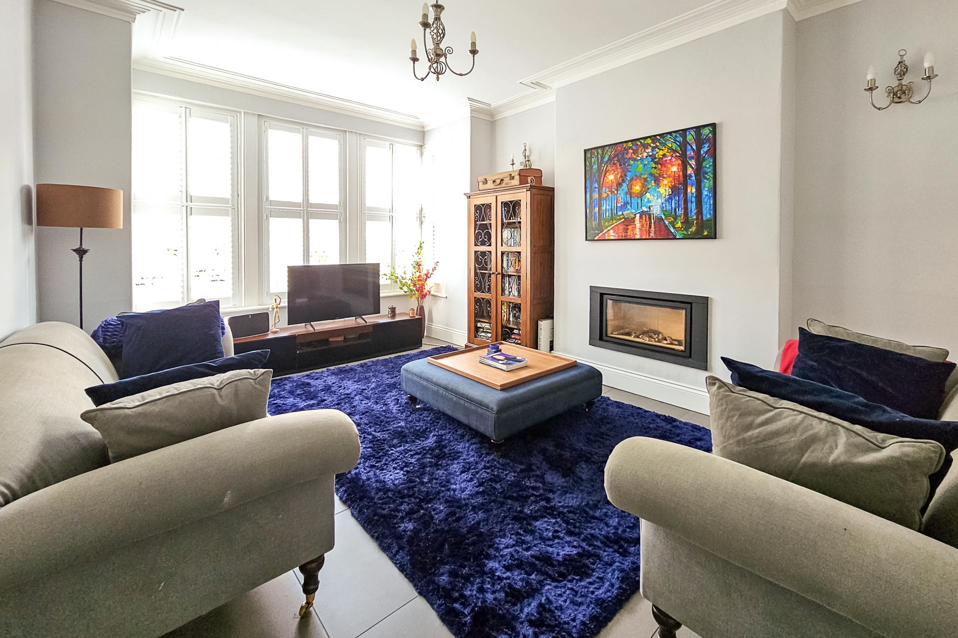 A spacious reception room with fitted shutters and a contemporary wall-mounted gas fire.