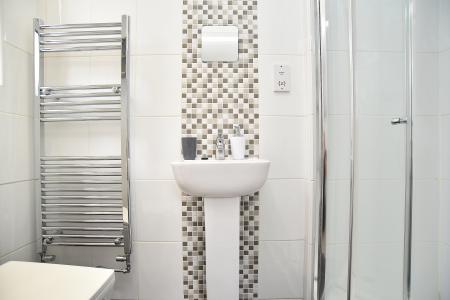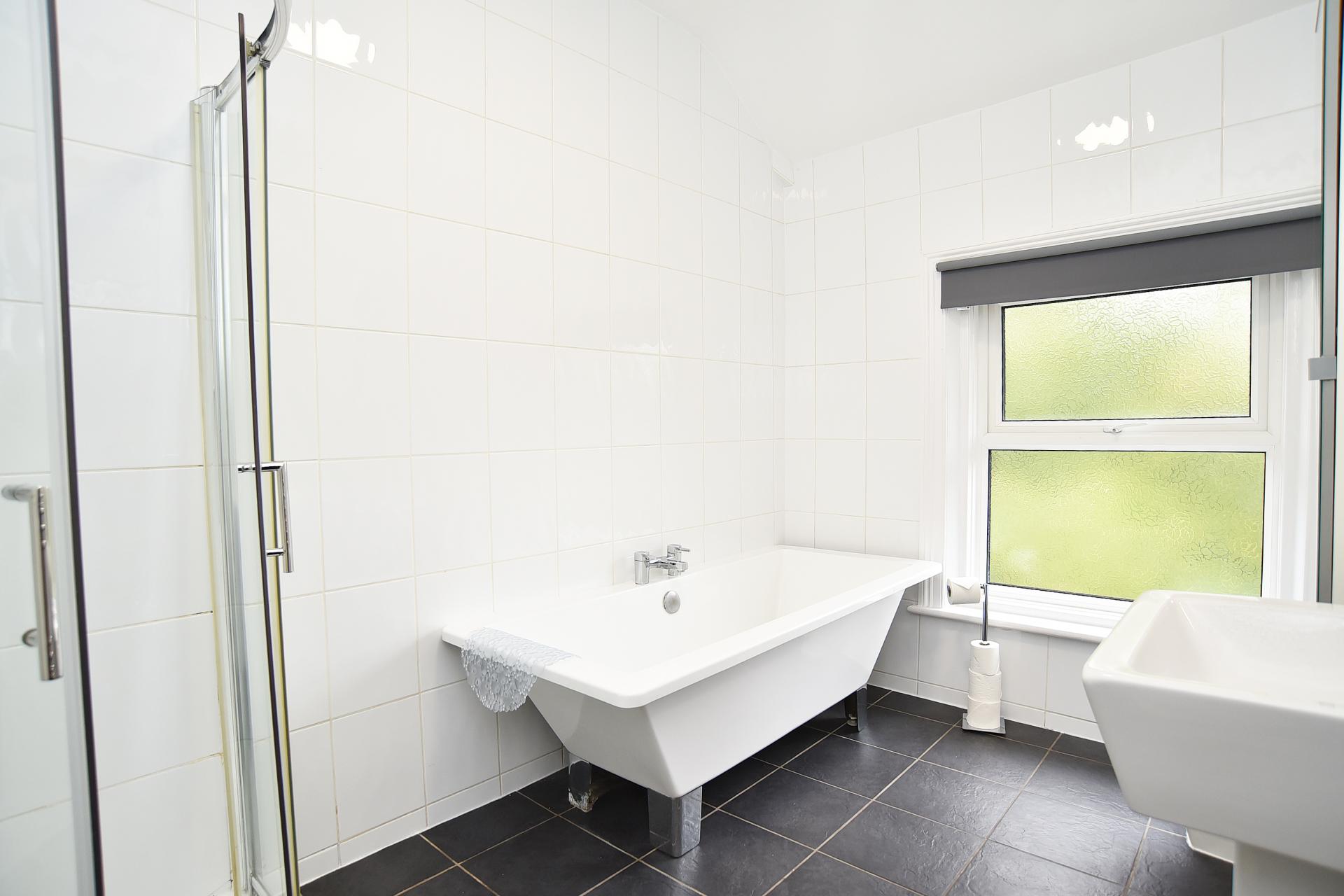 A contemporary suite comprising WC, hand basin, large bath and separate shower.