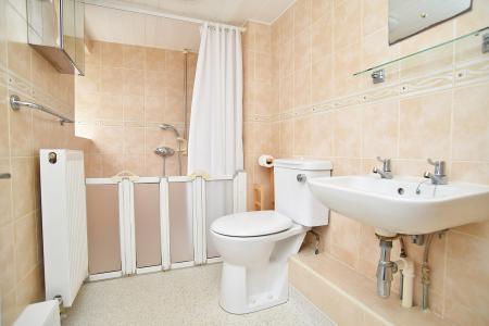 Modern white suite comprising low-level WC, wall-mounted washbasin, radiator, walk-in wet room / shower area housing fitted shower, two double glazed windows to side aspect. Tiled walls