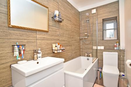 Modern suite with bath having shower over and screen, low-flush WC and vanity unit with washbasin. Window to rear elevation.