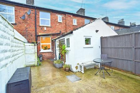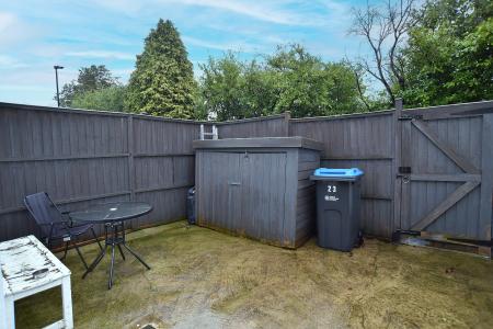OUTSIDE Small gravelled forecourt garden to the front. To the rear there is a good-sized enclosed yard area with a lean-to store, timber garden shed, high fencing and hand gate to a useful rear access road.