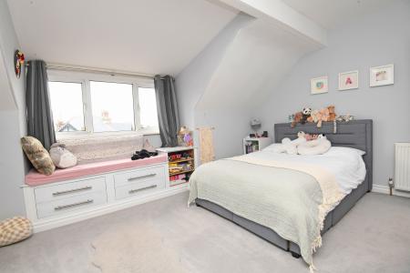 A very large bedroom with bay window and feature fireplace. Space for sitting area. Fitted wardrobes and en-suite shower room.
