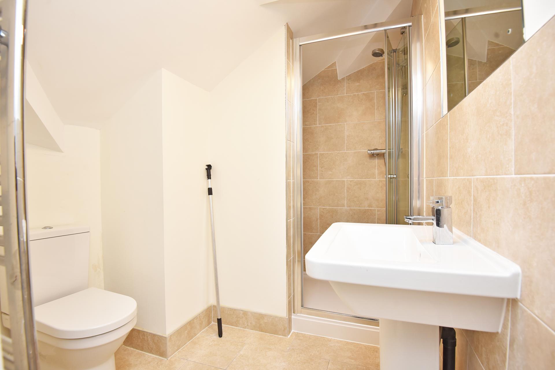A white suite comprising WC, basin and shower. Tiled walls and floor. Heated towel rail.