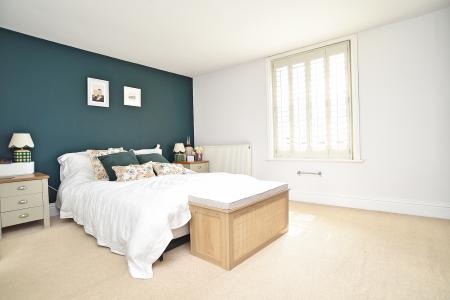 A double bedroom with fitted wardrobes and drawers. Window to rear with fitted shutters.