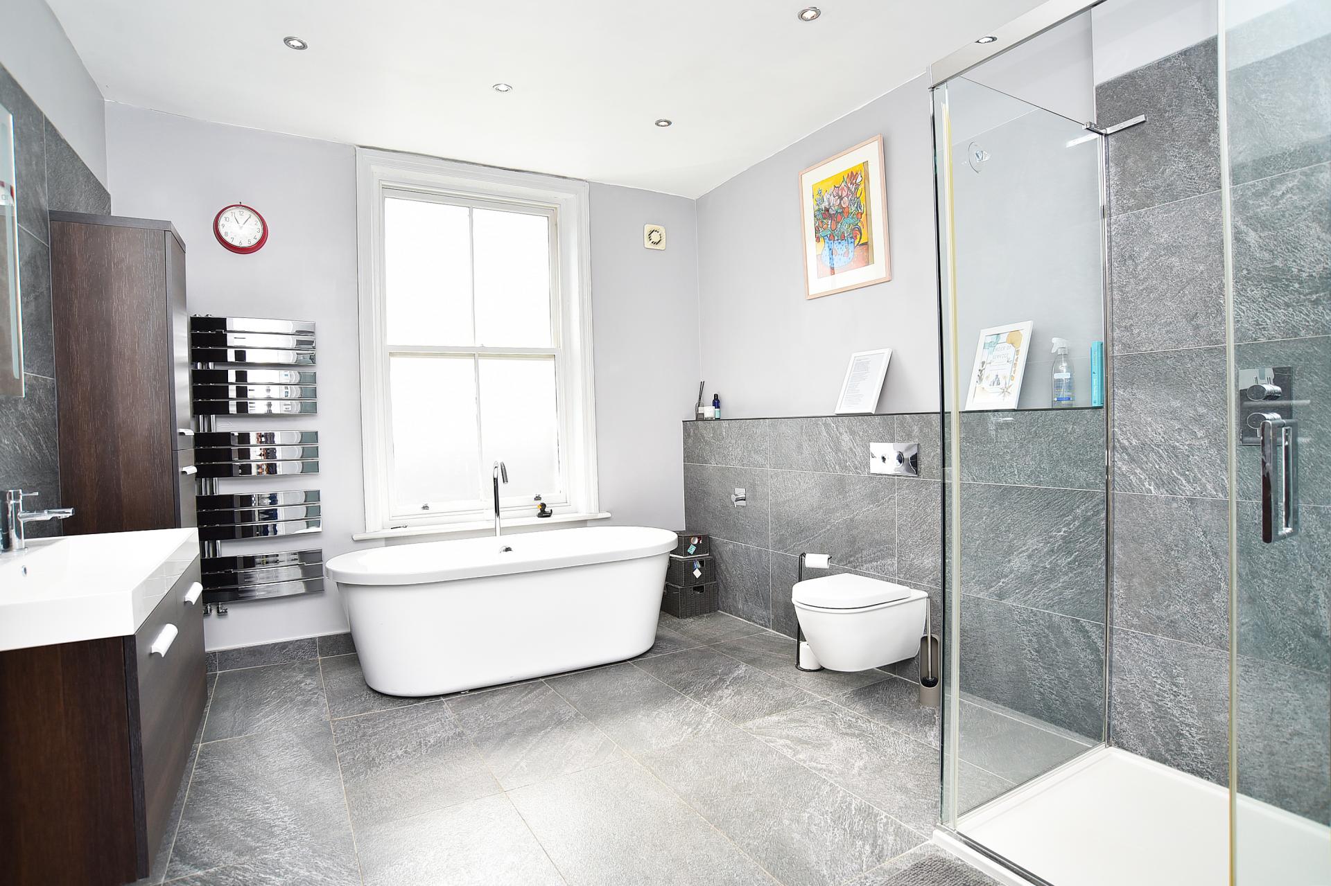 A large bathroom comprising a white modern suite with WC, washbasin set within a vanity unit, freestanding bath and large walk-in shower. Tiled walls and floor. Heated towel rails.