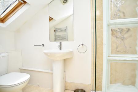 A white suite comprising WC, washbasin and shower. Heated towel rail. Tiled walls and floor.