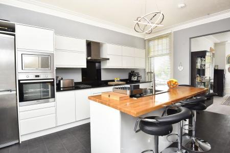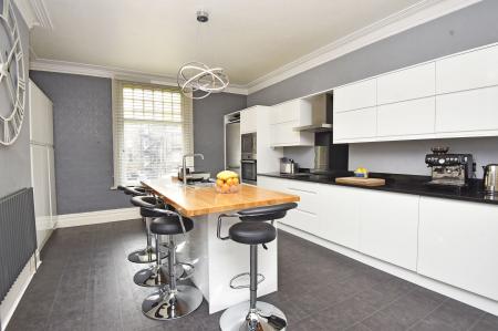 With a range of stylish wall and base units with granite worktops and island with oak worktop and breakfast bar. Electric hob, integrated oven, microwave and dishwasher