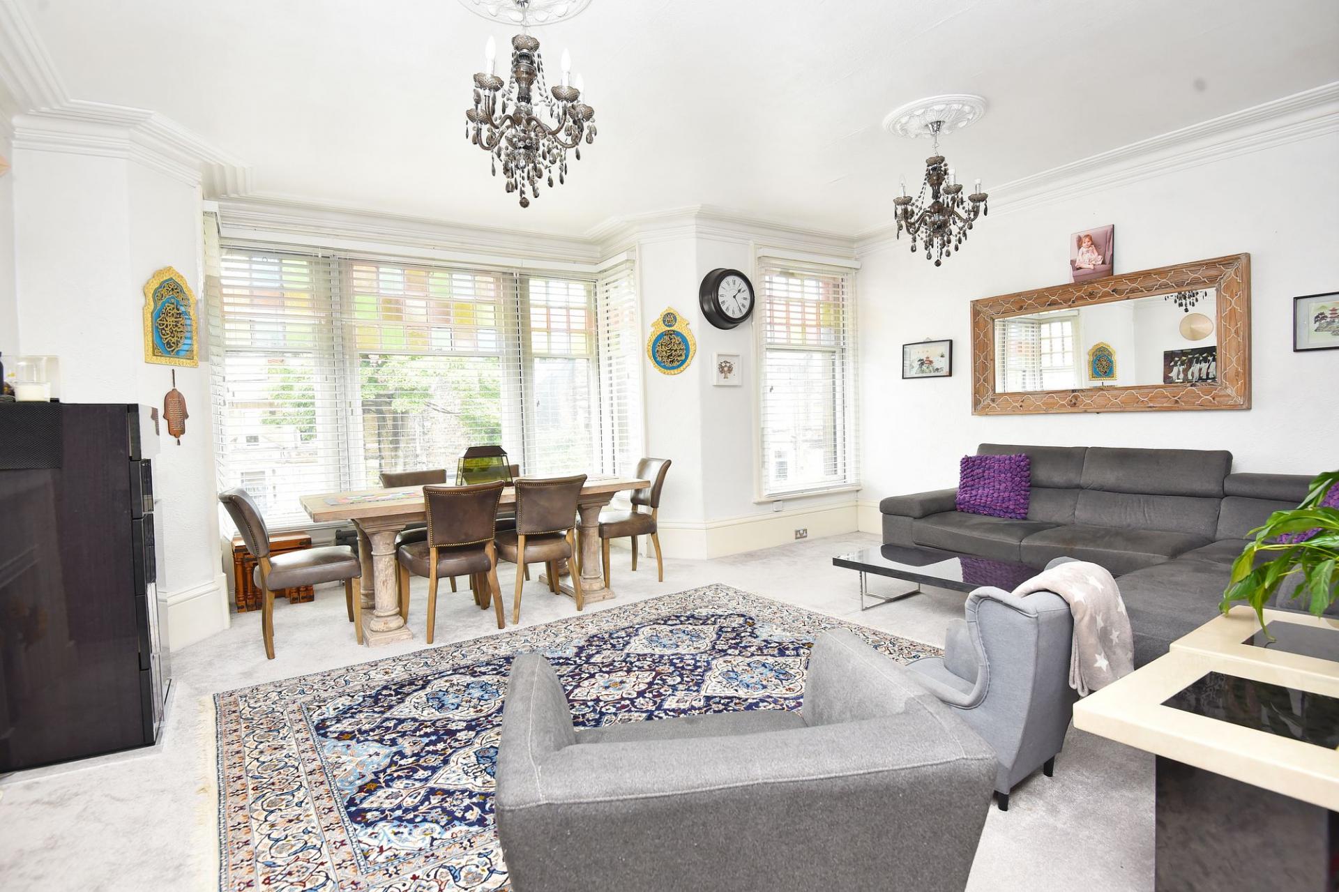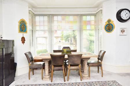 A stunning large reception room with sitting and dining areas, feature fireplace and bay window to the front.