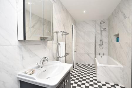 These rooms are served by a stylish house bathroom, recently renovated to a high standard, featuring tiled flooring, a shower over the bath, and a useful storage cupboard.