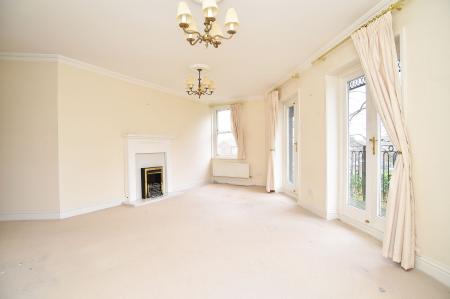 The generous living room is naturally bright, enjoying dual-aspect windows and two sets of double doors opening onto a private balcony with pleasant views over the immaculately maintained communal gardens.