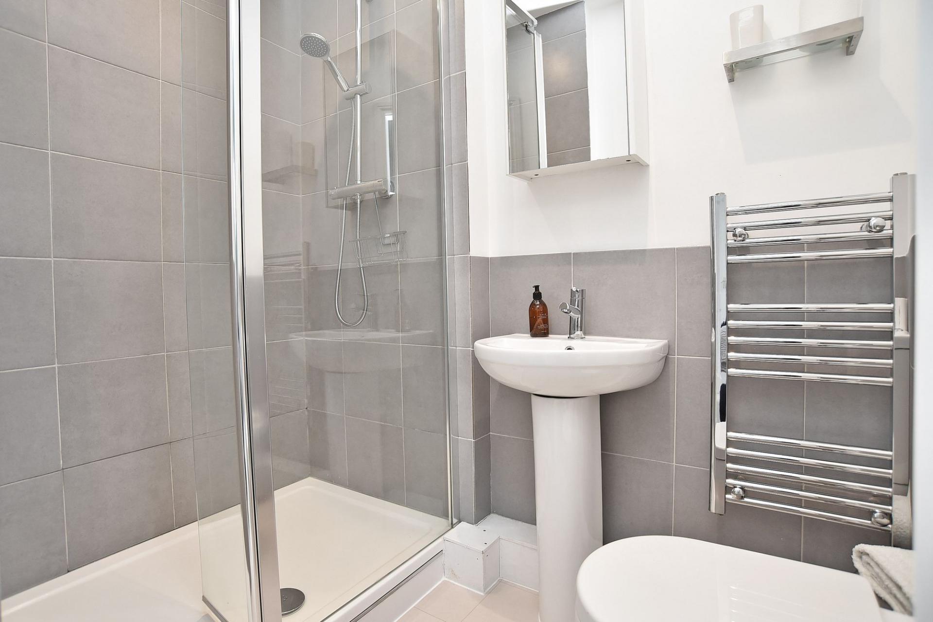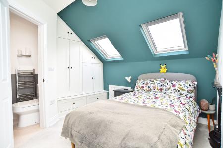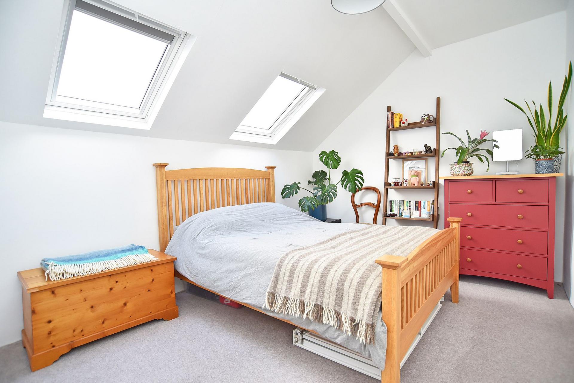 The second floor provides two further double bedrooms, both enjoying excellent natural light from skylight windows and offering flexible accommodation for family members, guests or those working from home. The green bedroom benefits from fitted storage and a modern en-suite shower room with contemporary fittings.