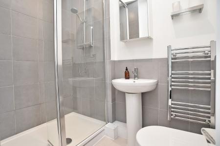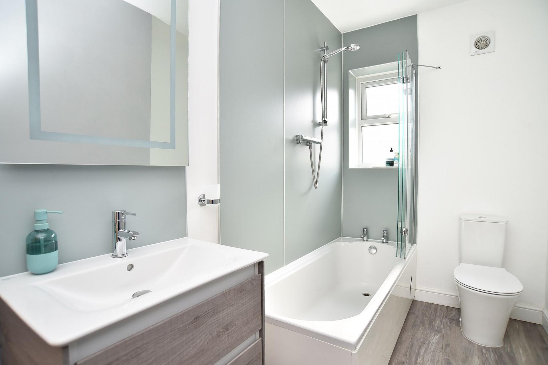 To the first floor are two generous double bedrooms, both light and comfortable rooms with ample space for bedroom furniture. The house bathroom is finished in a clean, contemporary style, featuring a modern white suite with bath and shower over, vanity wash basin and WC.