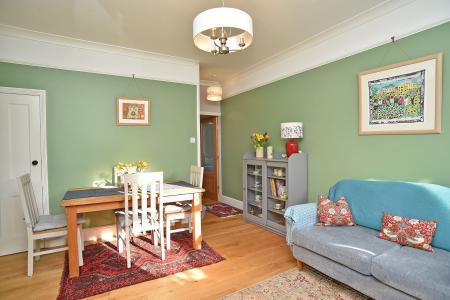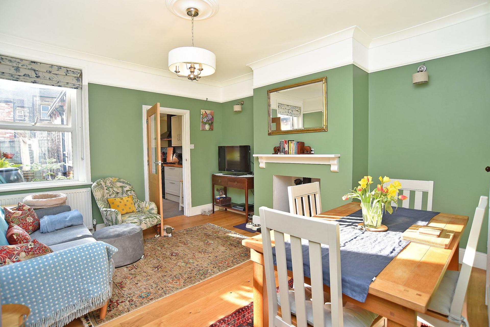 The ground floor opens into an elegant sitting room, a welcoming space centred around a charming period fireplace with tiled inset and painted surround. High ceilings with decorative cornicing and a large front-facing window create a lovely sense of light and character, making this an ideal room in which to relax.