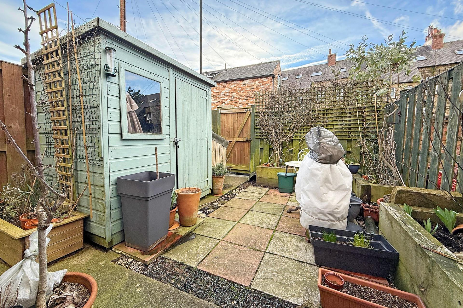 To the rear is an enclosed west-facing courtyard garden — a private and low-maintenance space ideal for sitting out and enjoying afternoon and evening sunshine. Paved seating areas, planted borders and a useful timber garden shed complete this pleasant outdoor setting.