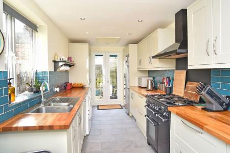The kitchen is stylish and well appointed, fitted with modern cream units complemented by solid wood worktops and attractive tiled splashbacks. A range-style cooker forms a focal point, and a glazed door opens directly onto the rear garden — perfect for summer dining and easy indoor-outdoor living.