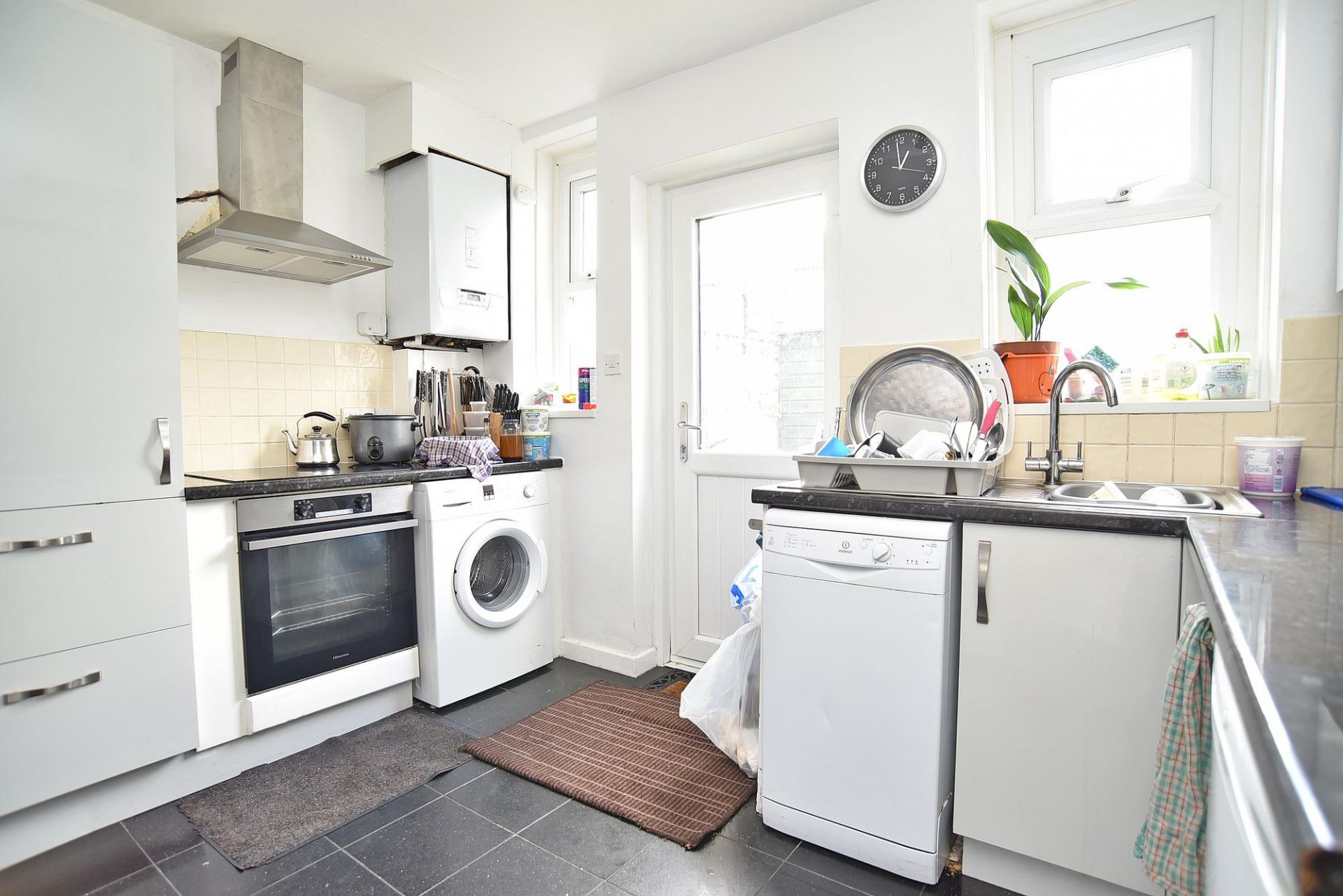 Fitted with a range of units, electric hob, integrated oven and space for appliances. External door leads to the garden.
