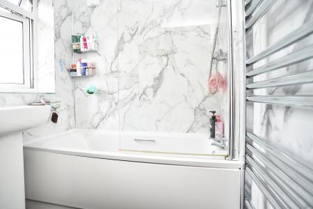 A white suite comprising WC, basin and bath with shower above. Heated towel rail.