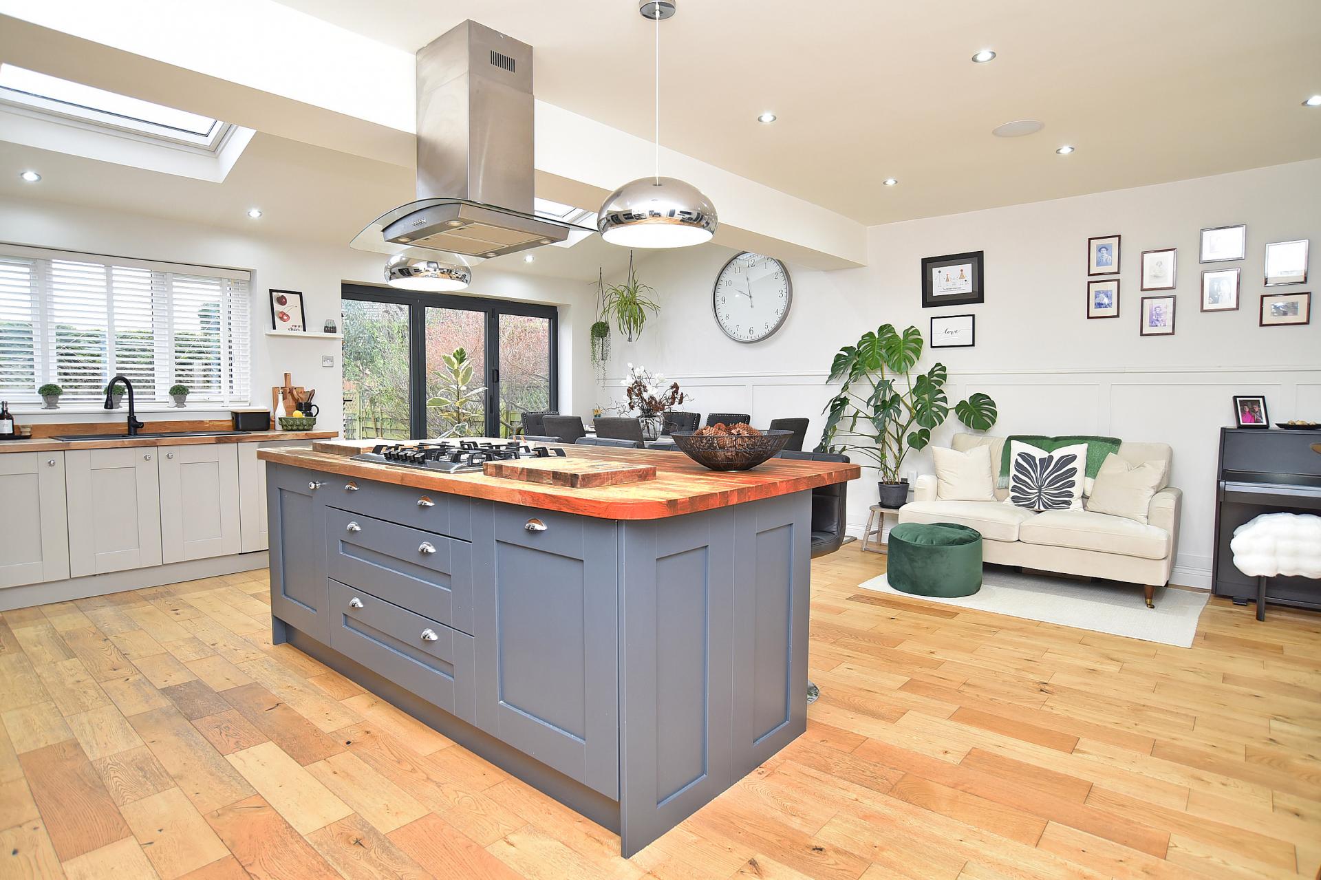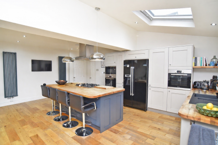 ACCOMMODATION The heart of the property is an impressive open-plan living, dining, and kitchen space, meticulously designed with bespoke cabinetry, solid wood worktops, and a striking central breakfast island. The kitchen is superbly equipped with a range of integrated appliances, including a double oven, microwave, American-style fridge freezer, and dishwasher, along with a useful storage cupboard. Velux windows flood the room with natural light, while bi-folding doors open seamlessly onto the private, fully enclosed rear garden, creating an ideal space for indoor-outdoor living and entertaining. A separate utility room/ office adjoins the kitchen.