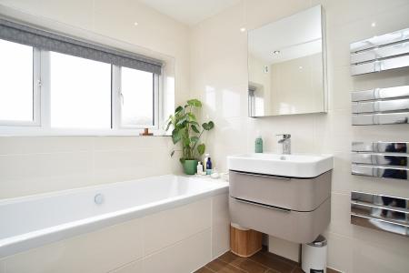 To the first floor, a spacious open landing leads to three beautifully proportioned bedrooms, with the principal bedroom benefiting from fitted wardrobes. The house bathroom is finished to a high standard, featuring a sleek bath and a separate walk-in shower enclosure, complemented by a modern low-flush WC and a chic vanity unit with inset wash basin, creating a stylish and contemporary retreat.