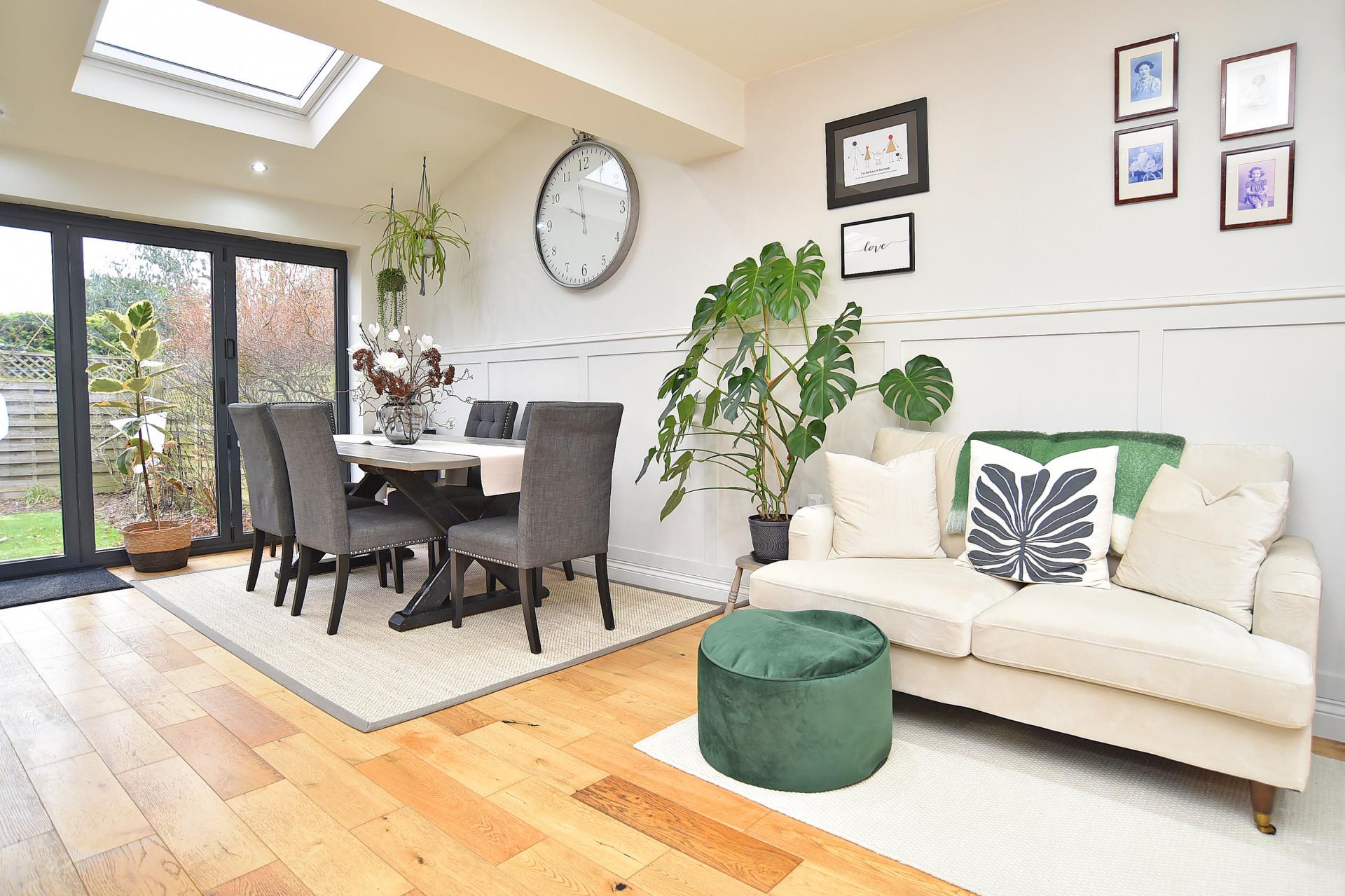 The ground floor also features a chic living room, a welcoming entrance hallway, and a guest WC. In addition, the converted garage has been fully insulated and benefits from its own separate access. Currently used as a home business, this versatile space would also be ideal as an additional reception room, home office or fourth bedroom.