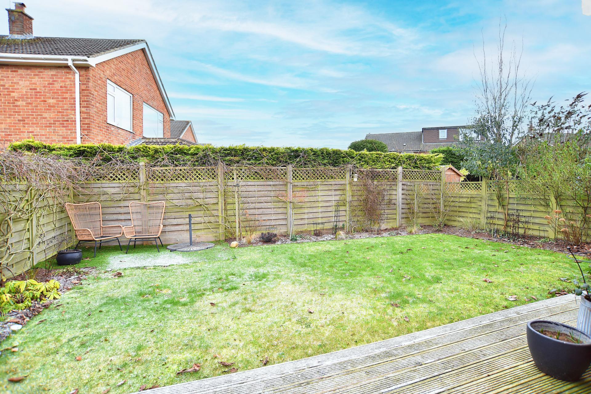 OUTSIDE Externally, the property offers parking to the front, providing an example of off-street parking. To the rear is a fully enclosed garden featuring a decked seating area and a shaped lawn.