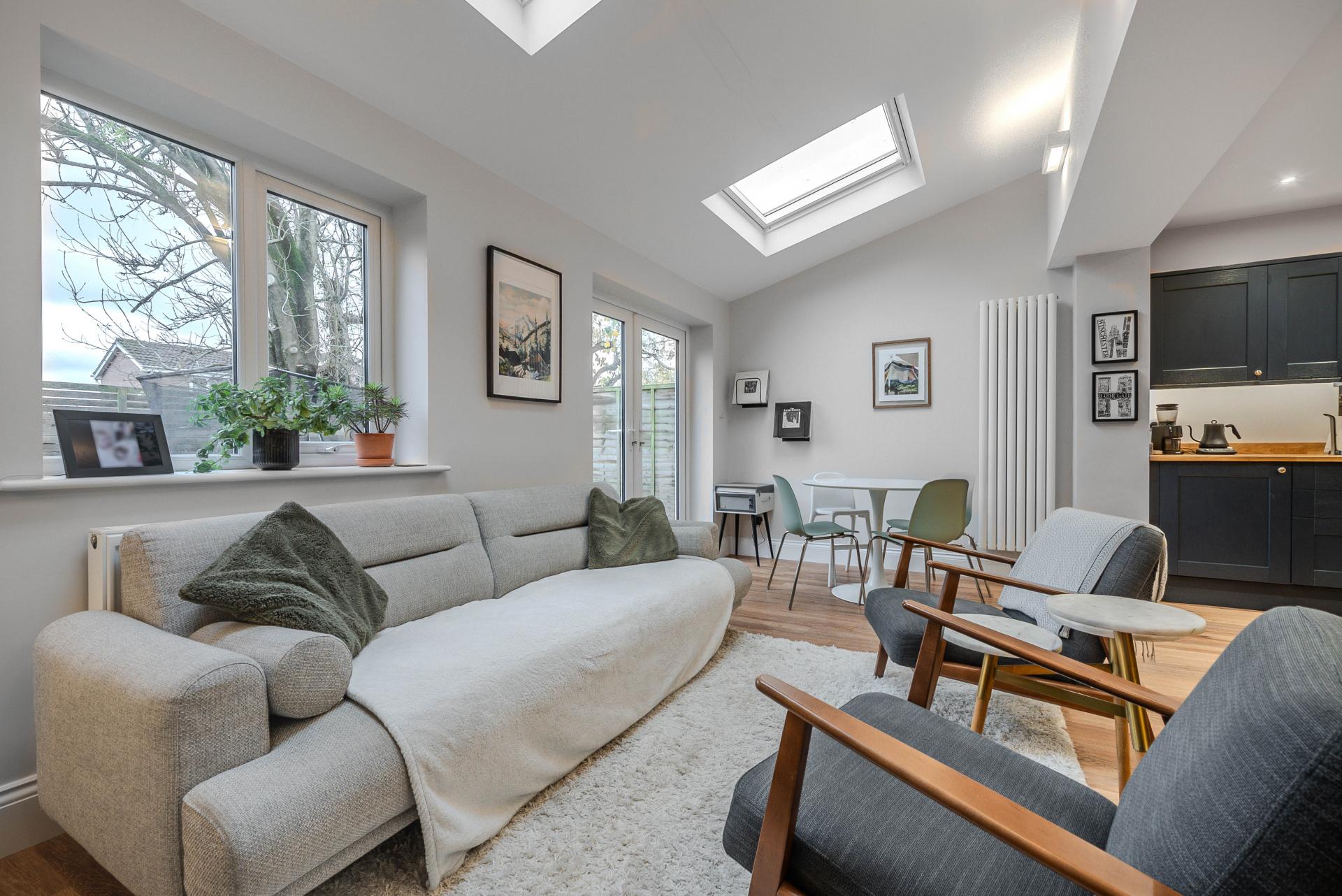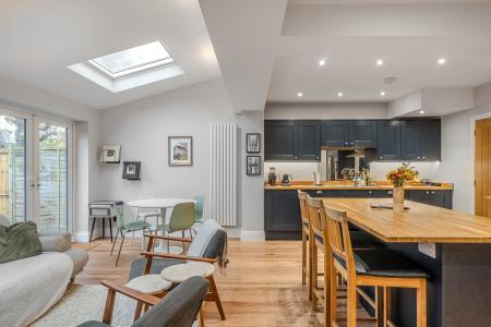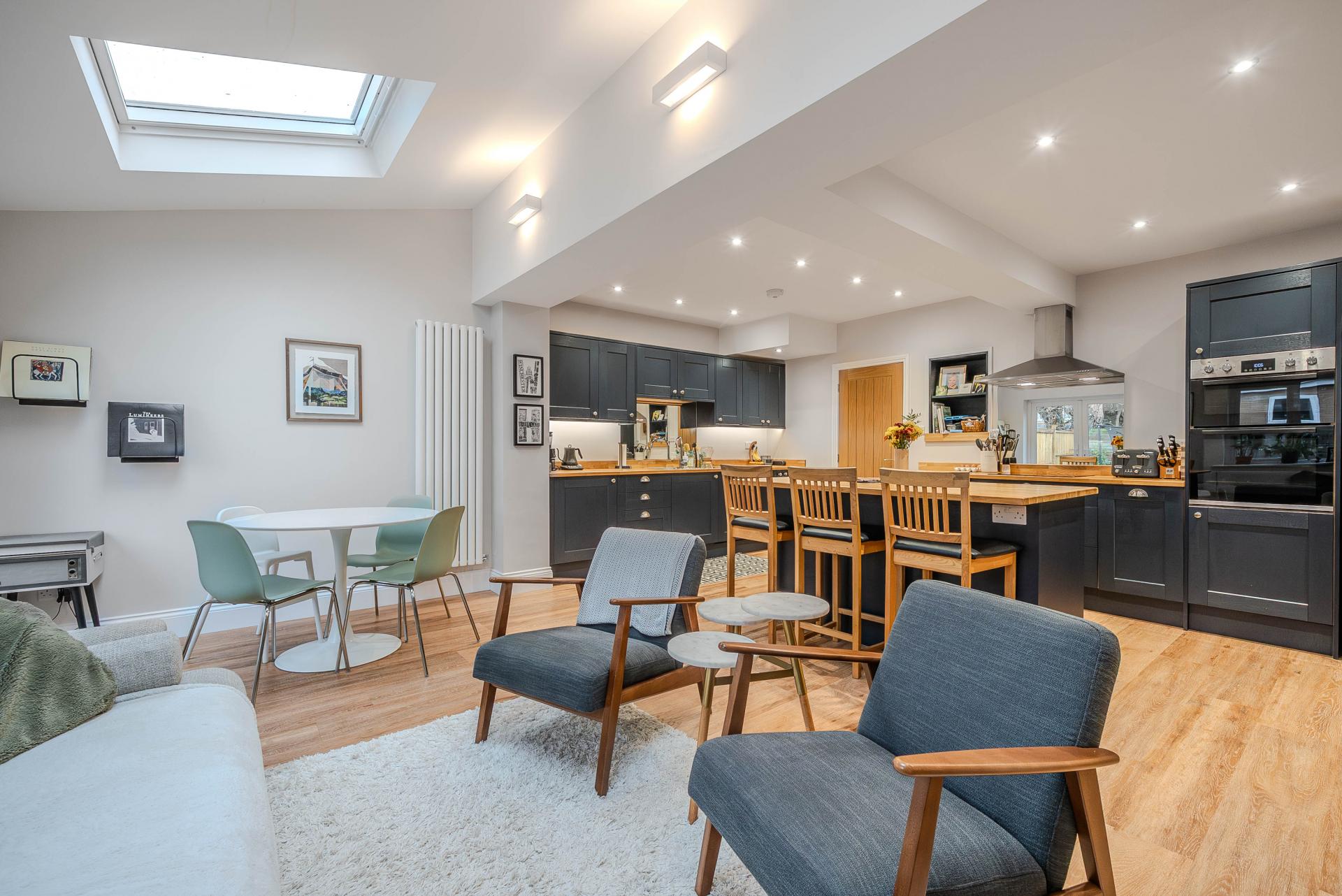 A stunning open-plan living kitchen with sitting and dining areas, skylight windows and glazed doors leading to the garden. The modern kitchen comprises a range of stylish wall and base units with island, oak worktops and breakfast bar. Integrated appliances include an induction hob, double oven and dishwasher.