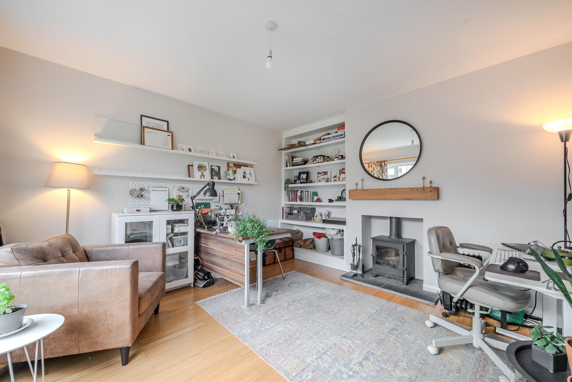 A spacious reception room with window to the front, woodburning stove and fitted shelving.