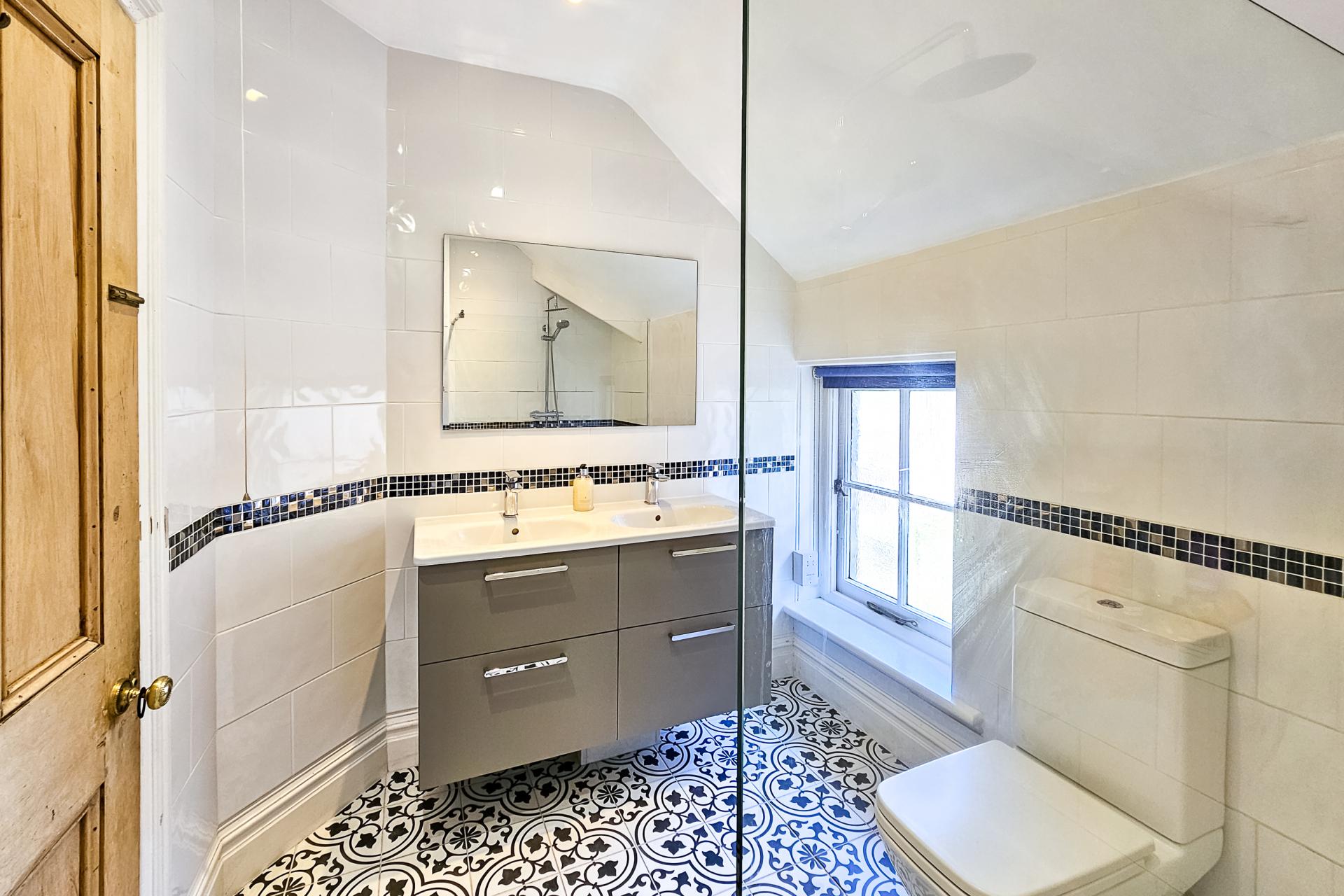 There are two good-sized double bedrooms on the first floor with bay windows. The main bedroom has an en-suite shower room.