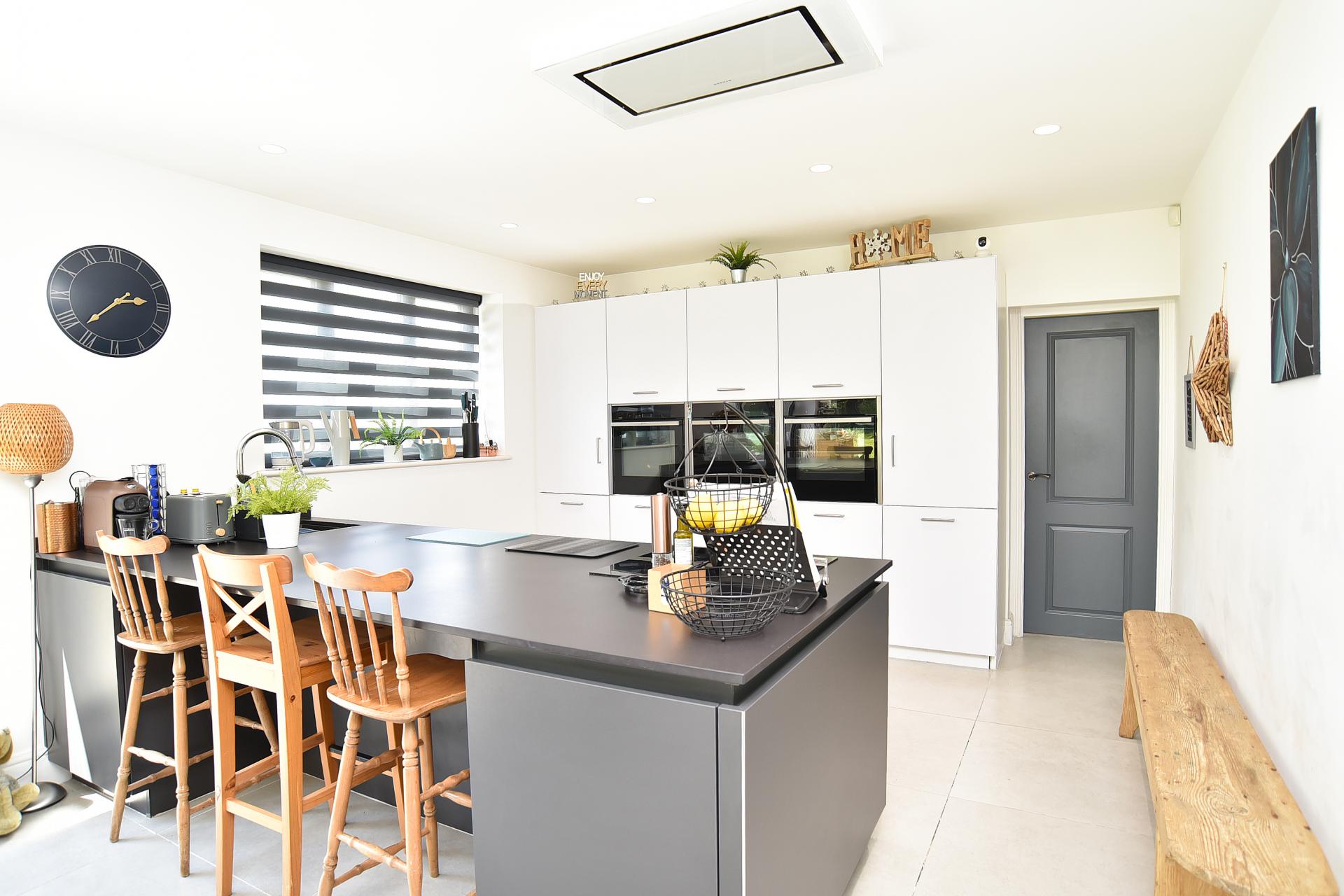 A stunning open-plan living space with sitting and dining areas and bi-folding doors opening onto the garden and skylight windows. Incorporating a range of modern wall and base units, work surfaces and breakfast bar. Integrated appliances include oven, microwave oven, steam oven and warming drawer. Full-size integrated fridge and freezer and dishwasher. Tiled floor with under-floor heating.