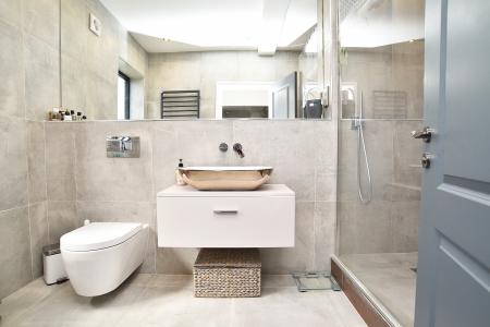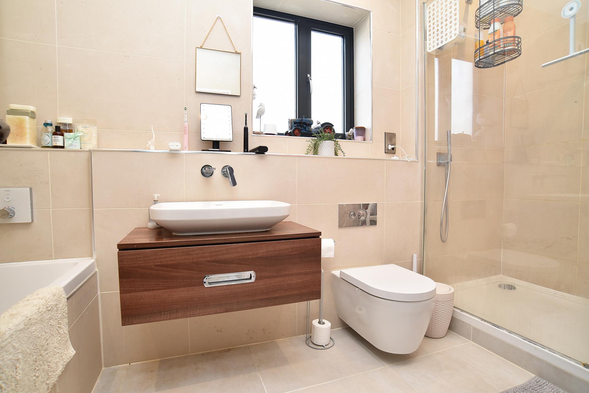 A modern white suite comprising low-level WC, washbasin set atop of a vanity unit, large walk-in shower and bath. Heated towel rail, tiled walls and tiled floor with under-floor heating.