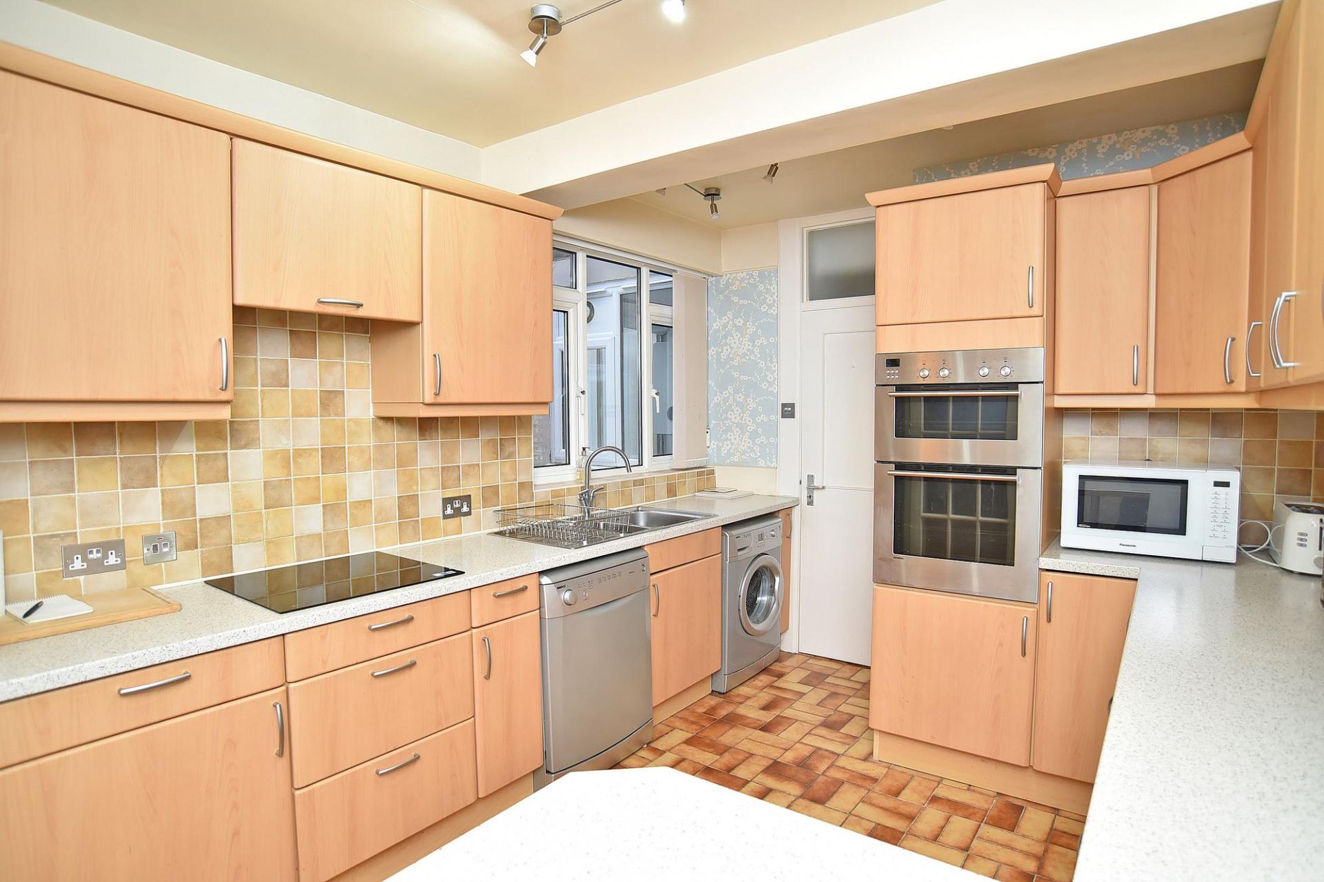 Fitted with a range of modern wall and base units with worktop and breakfast bar. Electric hob, integrated double oven and space and plumbing for appliances. Window to the rear. Rear entrance door.
