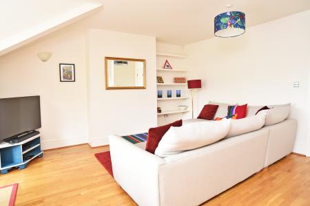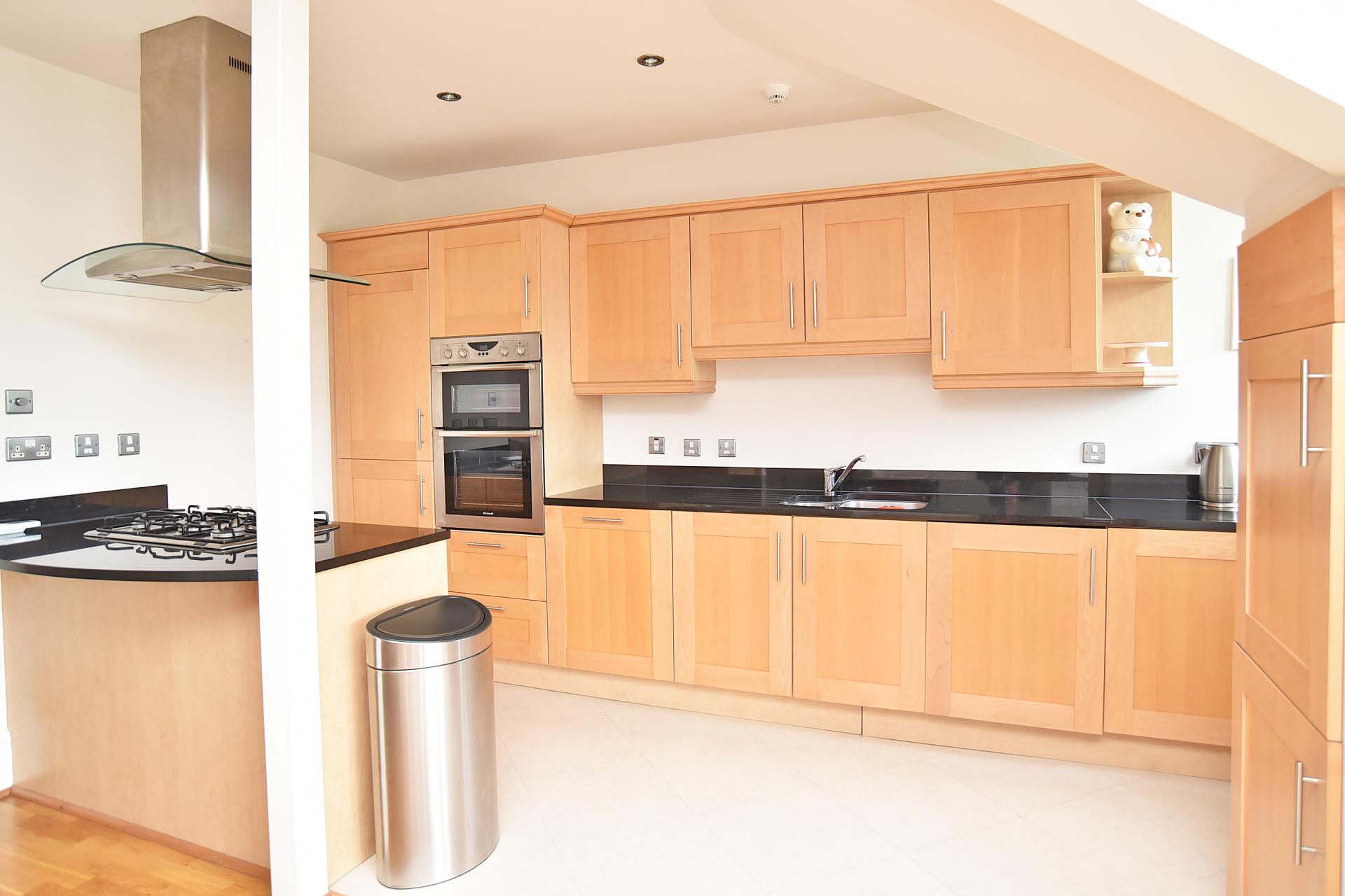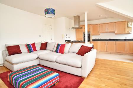 A stunning open-plan living space with window to front overlooking the Valley Gardens. Spacious sitting area with fitted shelving and wooden floor. Fitted kitchen with range of wall and base units and granite worktop. Gas hob with extractor hood above and integrated electric double oven and grill. Integrated dishwasher and washing machine.