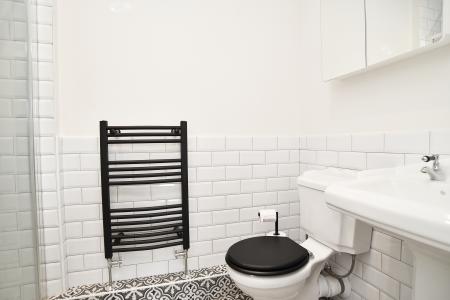 A modern white suite comprising WC, washbasin and shower. Tiled walls and tiled floor with under-floor heating.
