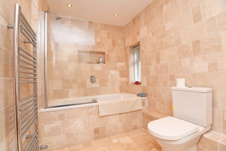 A white modern suite comprising WC, washbasin, and bath with shower above. Heated towel rail. Tiled walls and floor with under-floor heating.