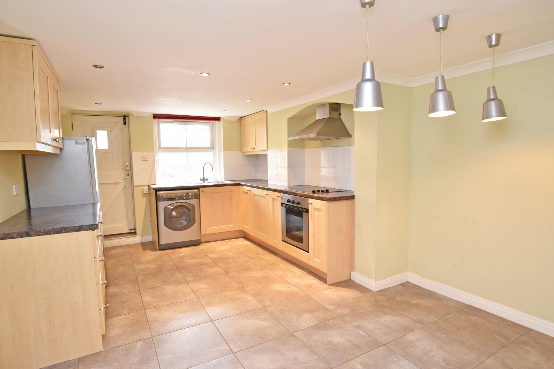 With generous dining area and tiled floor. Range of fitted wall and base units, electric hob, extractor hood above, integrated oven, space and plumbing for washing machine and fridge / freezer. Double-glazed window and exterior door to rear leading to a private outdoor sitting area. Tiled floor with programmable electric under-floor heating.