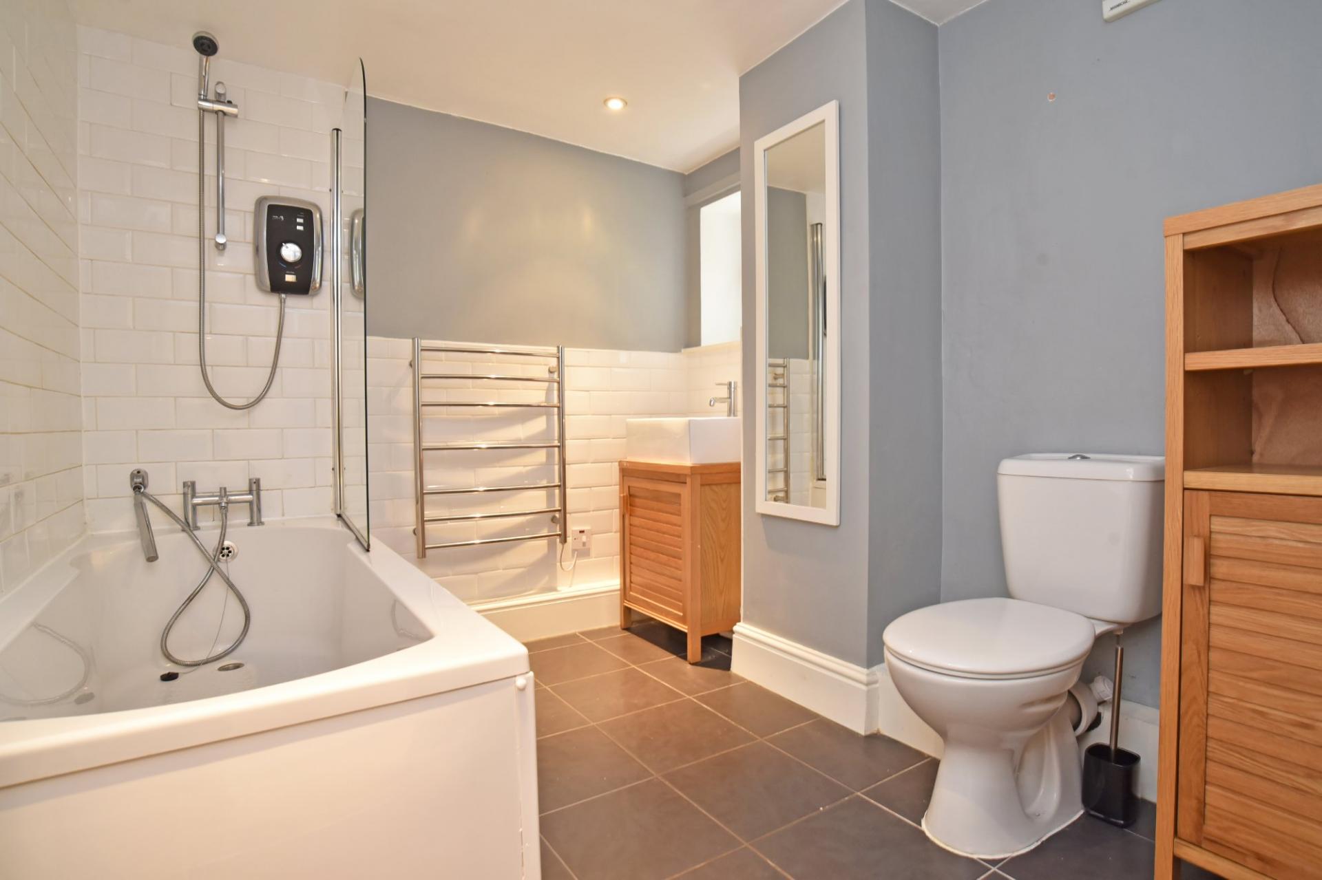 White suite comprising WC, washbasin set atop a vanity unit, and bath. Heated towel rail, double-glazed window to side and tiled floor.