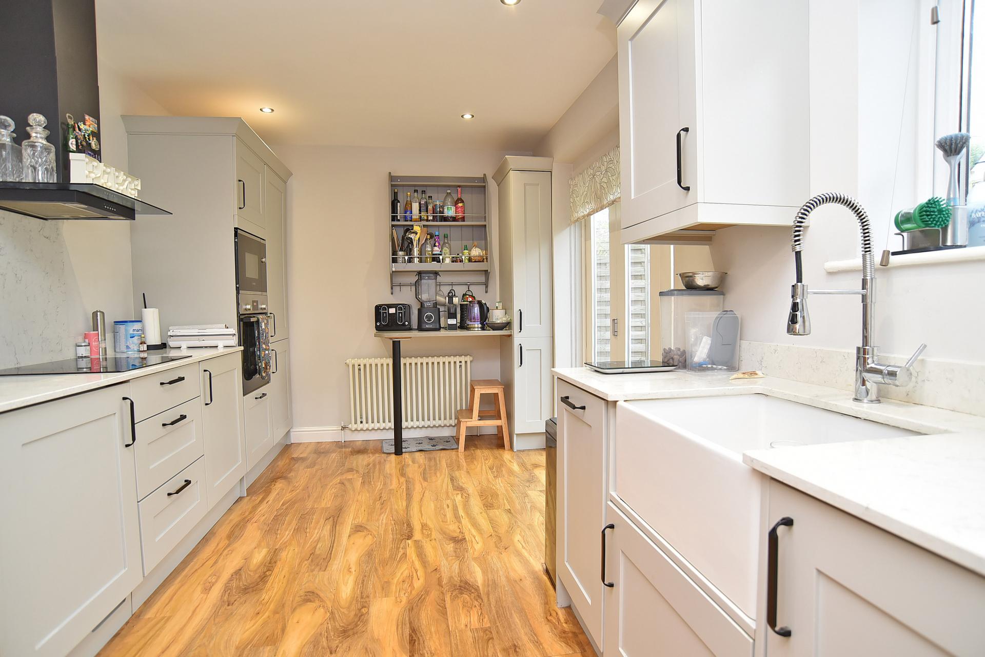 A stylish modern kitchen with a range of fitted wall and base units, Belfast sink, integrated electric hob, oven, microwave, dishwasher, fridge / freezer and washing machine.
