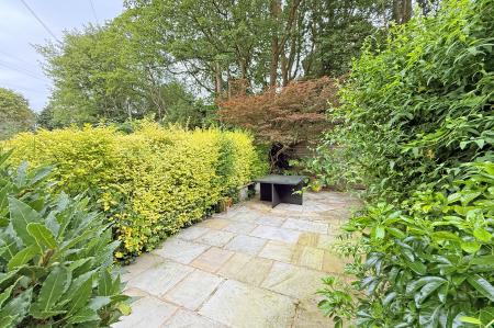 OUTSIDE Step into this enchanting front garden, where a meticulously paved pathway lined with neat box hedges leads you through a symmetrical entrance. Surrounding a captivating central focal point of vibrant purple slate, the mature shrubbery adds depth and visual interest to the landscape. This harmonious balance of structure and natural beauty creates a tranquil and charming space, inviting you into the home.