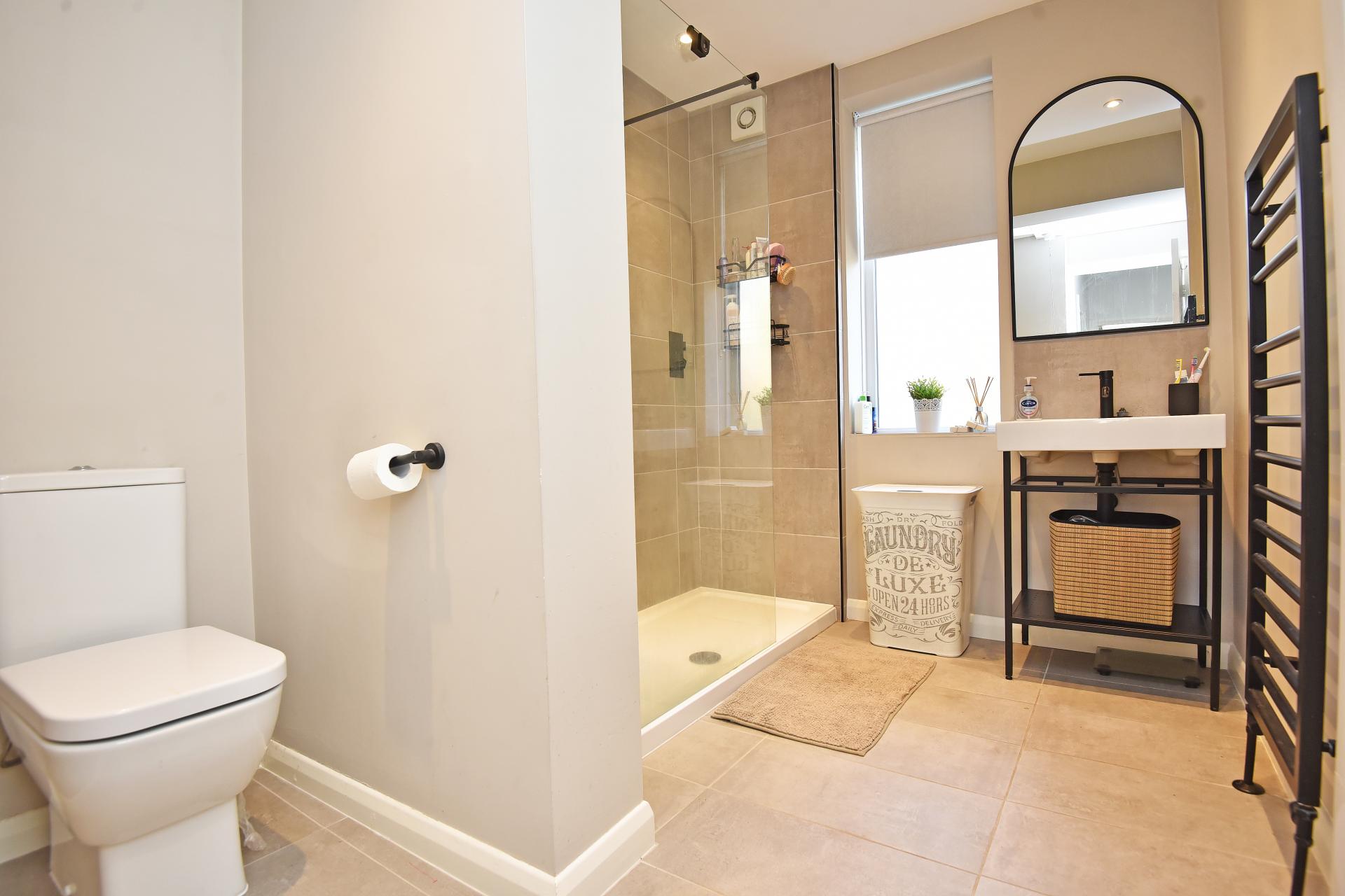 A modern newly fitted white suite, comprising WC, washbasin and shower. Tiled walls and floor. Heated towel rail.