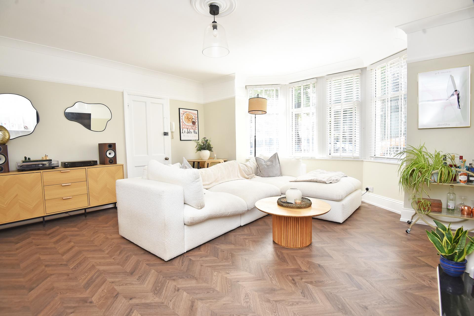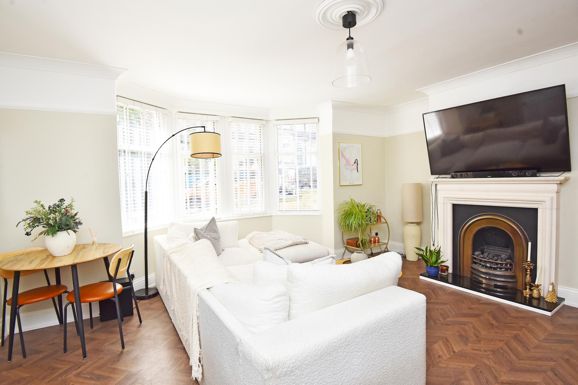 A large reception room with bay window and fireplace with living-flame gas fire.